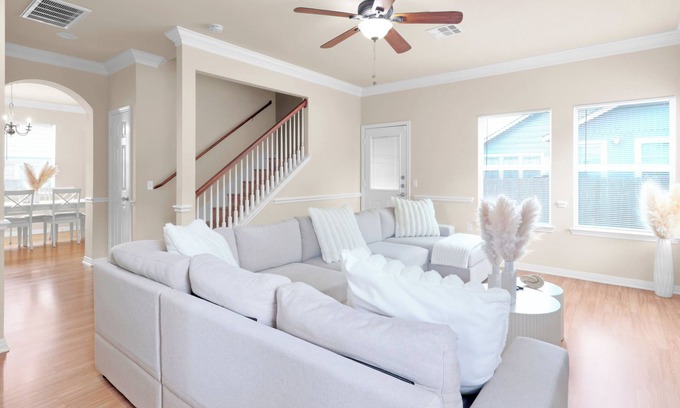 Welcome to our spacious, and cozy getaway home! With a 3 queen beds, queen sofa bed, bunkbed, and crib, as well as 3.5 bath in Austin Texas. Unwind in the cozy living room with a movie night challenge your friends to a game night or whip up a delicious meal in the fully equipped kitchen Step outside and breathe in the fresh air on the patio, perfect for enjoying morning coffee or evening BBQs.