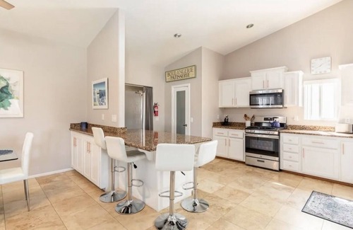 This remarkable home features an open-concept design that promotes comfort and connectivity among guests. The large living room and modern kitchen provide the ideal space for entertaining, while the backyard oasis includes a private pool and spa, BBQ area, and dining seating for eight. Guests can enjoy recreational activities like corn hole and ping pong, ensuring everyone has a wonderful time leading up to your wedding. With thoughtful touches throughout, such as Greek-inspired wall paintings, this home creates a serene atmosphere that enhances your celebratory spirit.