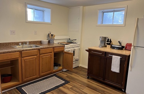 In addition to all of this, the initial lower level harbors a large family room accented with fresh new carpeting, knotty pine paneling, and a floor-to-ceiling brick fireplace with raised hearth and wood mantle, a spacious bedroom with king bed, and full bath as well as a walkout/up to the screened in porch and back yard. There is also a workstation in the corner of the family room designed the accommodate your remote work, supported by high-speed internet access and a desktop screen. The final lower level has a large rec room with two sofabeds, a full kitchen area, a six-person dining table, and a private walk-up/out entry. A laundry center with a utility sink, screened-in porch, and fenced-in yard provide complete comfort and convenience in this beautiful home. This beautiful home is furnished with brand-new furniture and beds/mattresses designed to make your stay pleasant and memorable.