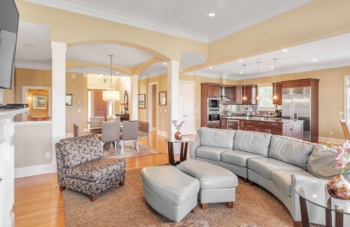 Beautiful Home located in the heart of the Sandhills, 4.5 miles North of Pinehurst, NC. Located in a very quiet community. 4 Master Suites with private bathrooms and can sleep up to 12 people. This home features a beautiful, full kitchen to cook your meals in, and it also has access to a shared pool for those hot days where a dip in the pool sounds just lovely. There is a fire pit for your nighttime enjoyment as well!