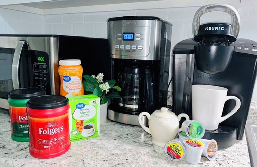 Fully equipped kitchen with microwave, smooth top stove, Keurig, Drip Coffee Maker, Hot Water Kettle, Blender, Toaster, and Sandwich Grill.