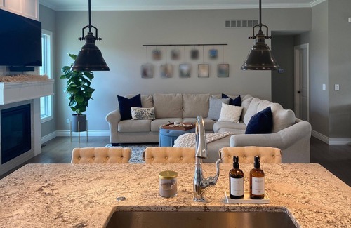 The house is located on a quiet street in a family-friendly neighborhood. It includes five private bedrooms, three full bathrooms and two living areas each furnished with a sectional sofa and TV. The open main level flows from the living room to kitchen while the basement living room is accompanied by a full wet bar. Enjoy your morning coffee as the sun rises over the backyard, explore all there is to do in Columbia from the nearby city trail system to downtown shops and restaurants, and end your day with cocktails on the back patio. The home is also equipped to accommodate young children with baby-proofing measures in place (baby gate, outlet covers, select cabinet latches) and books, toys and games all available for your use.