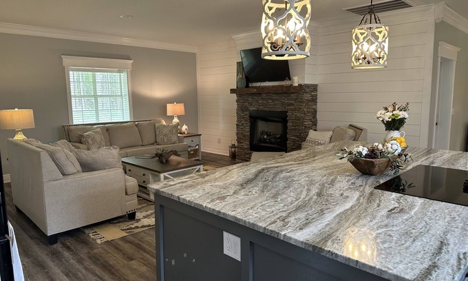 Modern farmhouse with oversized gourmet kitchen, formal living, dining room and keeping room with guest fireplace, it is an open concept for you to enjoy a sharing moment, there's a large from and back porches with outdoor sitting and TV come with fireplace and firepit comes with 6 acres.