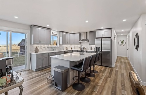 This country setting offers a unique experience with a barn and a corral on the property. Please admire the horses from a distance and refrain from getting too close for photos to ensure their safety and comfort. The house itself features a visual fireplace for ambiance, although it is not for guest use.