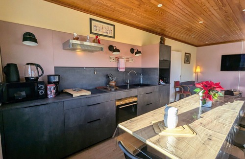 1 large living room with a new kitchen fully equipped with all appliances, refrigerator/freezer, microwave, filter and Senseo coffee makers, thermos, toaster, electric kettle, maxi plancha, raclette grill, etc. Open to the living room with 2 sofas, large wall-mounted flat-screen TV, Wi-Fi