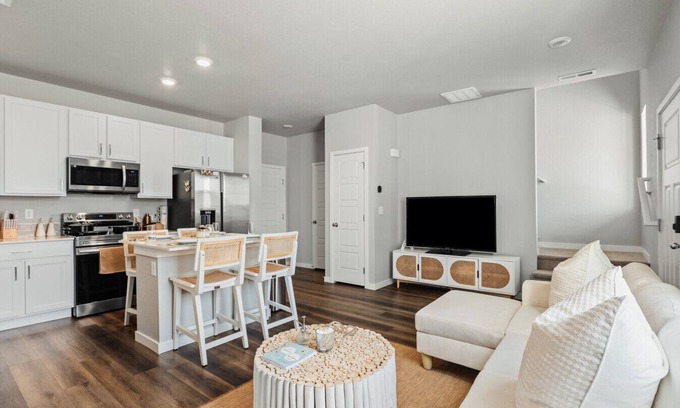 This modern townhome offers a spacious and thoughtfully designed layout. On the main level, you’ll find an open-concept living room perfect for relaxing, a half bath for convenience, a fully equipped kitchen for home-cooked meals, and access to the 2-car garage. Upstairs features two private bedrooms, each with its own ensuite bathroom. Bedroom 1 includes a cozy queen bed, while Bedroom 2 has two twin beds—great for kids or friends or work groups. One person is also welcome to sleep on the couch.