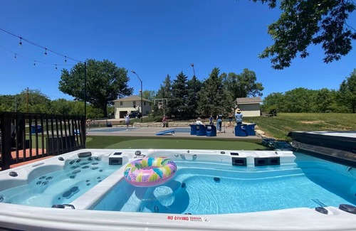This gorgeous house has three levels to enjoy and spread out in! You won't run out of space or things to do here. All bedrooms are spacious with several bonus rooms. Private pickleball/basketball court, swim spa with separate hot tub and endless pool, 7 hole mini golf, corn hole, gym (weights, peloton), grill, remodeled bathrooms and kitchen, oversized deck and tons of seating everywhere, perfect for a family or group get away! Amazing location down the street from the Speedway on the Sunflower Hills golf course and only two miles to the Legends, Sporting KC and much more.
