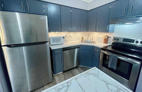 The living room features a new couch, and 50" Roku TV. The kitchen has seating for four, and a sliding door leading to the patio which also has seating for four.
