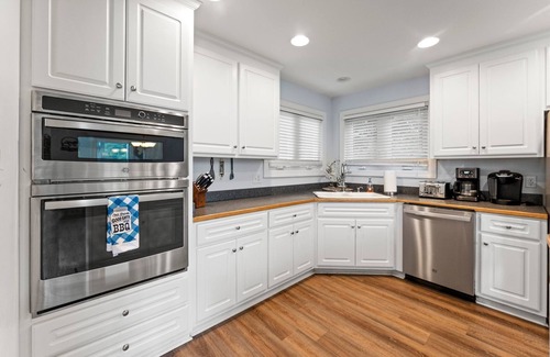 Now, attention to all chefs in the family and group!! We try our very best to keep the kitchen stocked with every cooking essential you could need on your vacation! Of course we don’t have your Great Aunt’s magical cake pan that you swear makes a perfect cake every time, but we try to cover all of our bases. Plenty of plates, forks, spoons, knives, and cooking utensils. The kitchen also has multiple appliances such as refrigerator and freezer combo, dishwasher, oven, microwave, 4 station stove-top, toaster, blender, griddle, crockpot, and for you coffee lovers we have both a Keurig and regular one pot coffee maker. We also have dining space at the island and an 8 person full length dining room table located right off of the kitchen area.