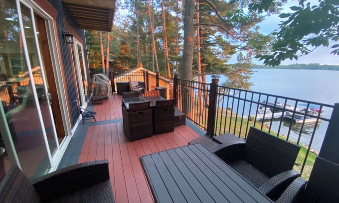 This newly constructed 3 story cabin offers the perfect getaway with stunning lakefront views and modern amenities. Sleeping 14, it features 3 master suites with king sized beds and a spacious bunk room (6 twin and 2 full sized bunk bed) for 8. Unwind in the private sauna or relax on two private decks and a large lakefront deck. Enjoy direct walk-out access to Pike Lake, ideal for swimming, boating or fishing. With its spacious layout, modern kitchen and cozy living areas, Upper Deck is your perfect retreat!