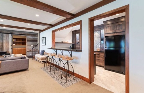 Spanning generous living spaces, the residence boasts a sophisticated yet inviting design, featuring one king bed, four queen beds, and a bunk bed, comfortably accommodating large groups or multi-generational families. The property is fully equipped with premium amenities tailored to the discerning traveler, including a state-of-the-art home gym, a rejuvenating indoor sauna, a bubbling hot tub, and a gas firepit with breathtaking views of the lake and majestic mountains.