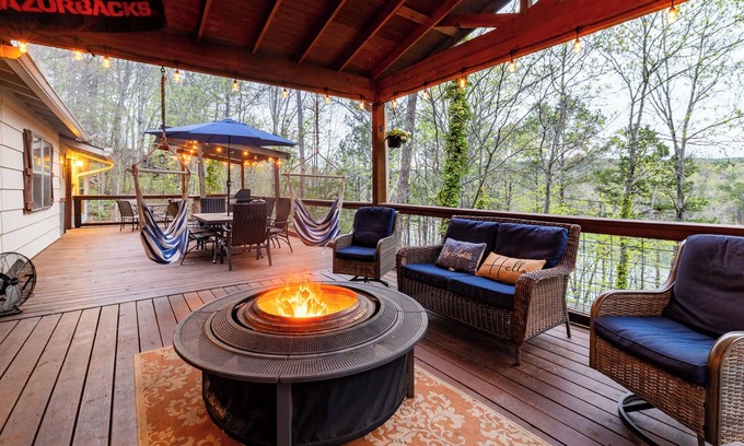 -Huge back deck with fire pit, hammock chairs, and outdoor TV