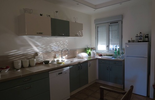 The former shed (wine barn) of the neighboring winegrower's house with thick old stone walls was rebuilt in 2015/16 into a holiday home with 130 sqm of living space on two floors and is located in the village. The entrance is via the large, fully equipped kitchen. From here it goes over a wide, with a sliding door demarcated wall opening into a salon with dining area and additional bed opportunity to relax. This room is connected via a large sliding glass door with a 30 square meters paved and landscaped courtyard / garden, which gets sun until the afternoon hours. Here it is very nice to eat or sit sociable with friends over an aperitif or glass of wine until late at night.