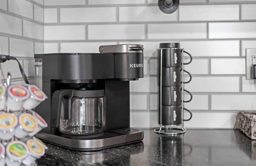 - Moving further in, the updated kitchen comes fully stocked and ready for all your culinary needs. It includes a full-size stove with a glass top range, refrigerator, microwave, and dishwasher. A Keurig coffee maker, complete with coffee, cream, and sugar, ensures you start each day right. All necessary cookware is also provided, so you’ll have everything you need to prepare delicious meals.