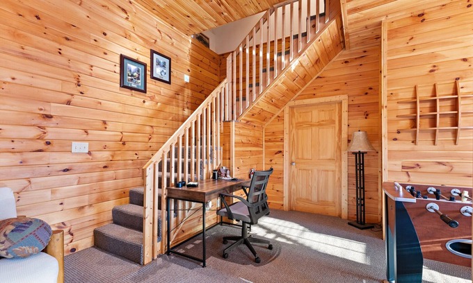 The upstairs landing makes for a cozy reading place. It leads to the king master bedroom with a TV, electric fireplace, and a private bathroom. Enjoy the gas fire pit on the third-level balcony. There are two additional bedrooms on the main floor, one with a queen bed and one with two twins. They share a hallway bathroom. The lower level family room has two queen-sized futons and a queen air mattress which can host two people each. High Country Haven can accommodate 12 guests, assuming two (2) people on each futon and the air mattress, which might be tight for adults but comfortable for children. Plan accordingly. The family room also includes a foosball table, arcade game, Smart TV, work desk, gas fireplace, and a full bathroom. The lower level deck accessed through the family room has seating and a hot tub overlooking seasonal views.