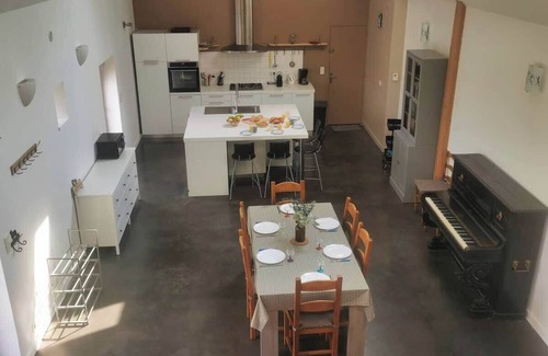 The large room on the ground floor accommodates a living room with fireplace, a dining area with a large table, a modern kitchen with a central island. On the ground floor, you will also find in the back kitchen, a storage room opening directly outside with washing machine, an iron and an ironing board.