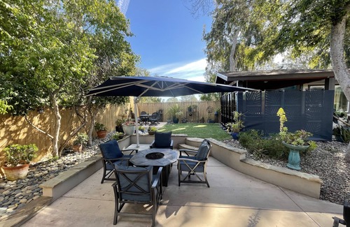 Large marvelous tree shades much of the yard. Green artificial lawn is flanked with beautiful plants and shrubs. There are two seating areas. One seating area for playing games or eating. One conversationional group area. All places are perfect to relax after a fun filled day on your majestic Del Mar beaches.