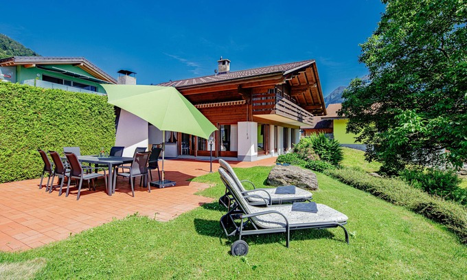 Find Serenity in a historic Swiss village nestled between turquoise Lake Brienz and majestic mountains. Brienz Villa on Alpgasse is a stylish home with truly breathtaking views and is ideal for family gatherings. The private patio with outdoor fireplace and covered dining area is a place you will want to linger; it's not just a place to sleep, but a home to truly enjoy. It is a 5 min walk to swimming spots, grocery store, and lakeside restaurants, and 12 min to the ferry/train station. Four bedrooms upstairs sleep 8 persons, a lower level bedroom and sofa bed sleeps 4 more. Treat yourself to the luxury of a relaxing vacation and discover the Bernese Oberland from here!
