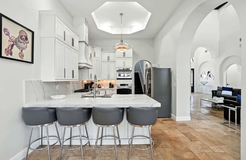 Gourmet Kitchen: Cook and entertain with ease in the fully equipped kitchen featuring quartz counters, a gas range, premium stainless steel appliances with a mini fridge and an casual island with 4 barstools for casual dining. The adjacent formal dining area seats 6 and flows seamlessly to the lanai for indoor-outdoor living.