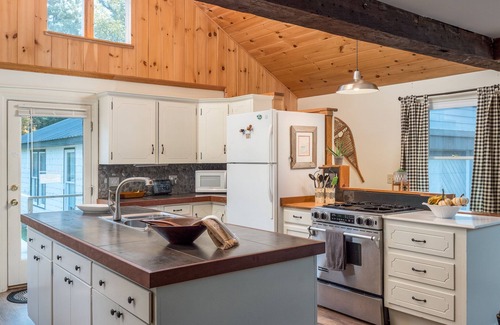Step outside and relax in the 6-person hot tub, or enjoy a night under the stars by the fire pit. The large, private property is perfect for winter fun—build a snowman or explore the snowshoeing trails that wind through the woods to a serene river. The peaceful surroundings offer the ultimate retreat after your days of skiing, hiking, or swimming.