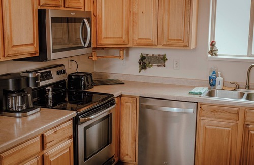 Vaulted ceilings and large windows create a sun-filled great room centered around a gas fireplace. The full kitchen with dishwasher handles everything from morning pancakes to family feasts. When summer arrives, air conditioning keeps the whole lodge cool.