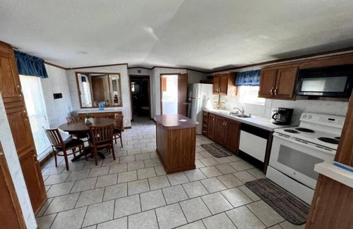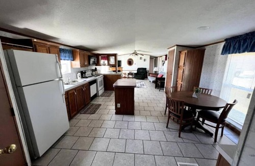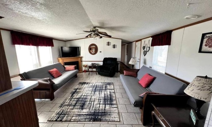 This charming park model house offers ideal accommodations for your next retreat. With three cozy bedrooms, you'll have ample room to relax and rejuvenate. The first bedroom is furnished with two comfortable twin beds, while the second bedroom features a lovely queen-sized bed, ensuring plenty of sleeping space for your family or group.
