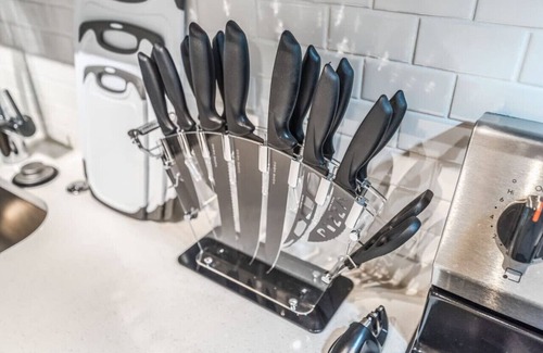 - A fully equipped kitchen boasts high-end appliances along with plates, glassware, silverware,