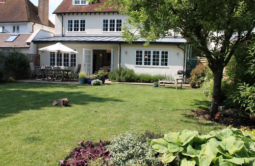 The modern kitchen is a social space, it has an island as well as plenty of dining and sofa seating. It leads onto the garden and outside decking area and is linked to the sitting room by glazed double doors. The comfy sitting room has two sofas, a piano and open fireplace. The 55'' 4K TV is connected to SKY TV and has a DVD player.
