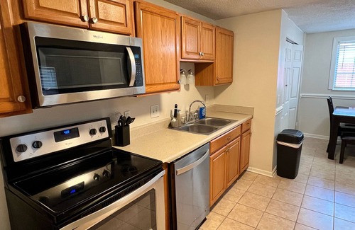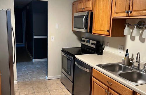 This Single Level Garden Ranch Home is equipped with 3 Bedrooms including Queen size beds in each room & 2 full Bathrooms, which can accommodate up to 6 guests. This Entire house has a Full Kitchen with a table that seats 6. Each Bedroom has lamps with built in outlet and USB port. The Family Room has a Fire Place, 70 inch Smart TV along with a Dedicated Work Desk & Spacious Sofa with Footstool. Our Fun Entertainment Room features a Pool Table, 70 inch Smart TV, Surround Sound System and Bar for Entertainment. The Master suite includes a tub with shower and a walk in closet with a 65 inch Smart TV. Our Spacious backyard is great for grilling, small gatherings and has a privacy fence for our guests enjoyment