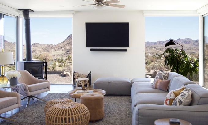 Spacious Modern Serene - gorgeous mountain landscape views is located in Joshua Tree Highlands. Spacious Modern Serene - gorgeous mountain landscape views provides accommodation, featuring Air Conditioner, Pet Friendly, Fireplace/Heating, among other amenities. This House features Air Conditioner, Pet Friendly, Fireplace/Heating, to make your stay a comfortable one.