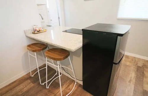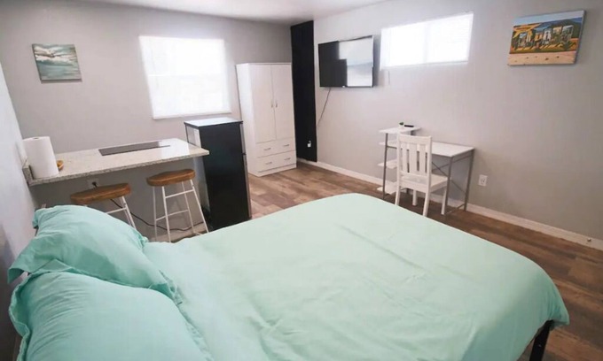 Just Listed! Modern Open Concept Studio Loft with Modern Kitchen, Large Bathroom, Cold A/C, 50" 4K TV and Fiber-fast Internet! Kitchen has granite quartz counter top, a bar-like table with three chairs, a small fridge to keep your beverages cold, a microwave, coffee maker, pots and pans to cook a quick meal. Comfy Queen-size Bed with a Wardrobe, A small desk and chair to work remotely. And a shared washer and laundry as well as a large BBQ to cook perfect steaks! Long stays Welcome! Contact us!