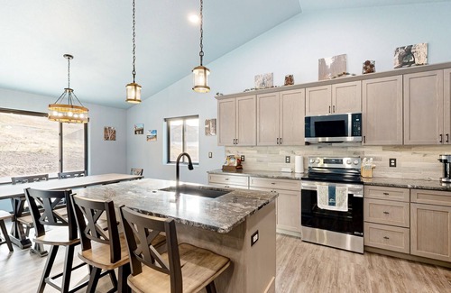 Step inside this brand new home and be greeted by a spacious layout that offers plenty of room to spread out and relax. The main living room features a large cozy sectional you'll just want to sink into and a gas fireplace, creating a warm and inviting atmosphere. High ceilings and large windows flood the space with natural light and offer stunning views of the surrounding mountains, making every meal in the dining room a scenic experience.