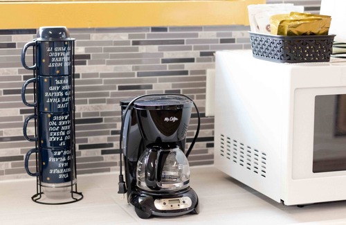 Our guesthouse has two spacious private studio room suites, each with a queen-size bed, storage spaces, clothing rack, complete kitchen amenities, a dining area with a table that seats 3, a cute living room corner, outside shared bathroom, free wi-fi, deck sitting area, and a washer and dryer.