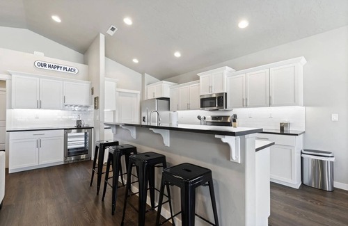 • Four barstools at the large counter make for easy conversation or quick meals.