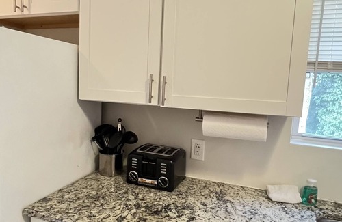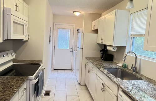 Kitchen: Bright and fully stocked (cookware, Keurig + drip coffee makers, microwave, dishwasher, etc.)