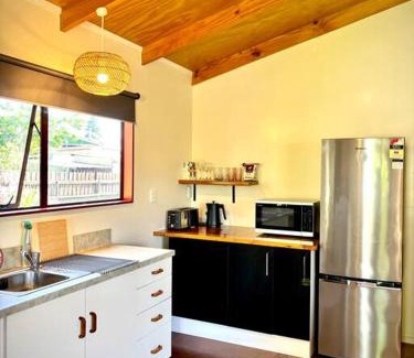 Providing a garden, Spacious one bedroom guesthouse close to town provides accommodations in Takaka. This property offers access to a patio, free private parking, and free Wifi. The vacation home consists of 1 separate bedroom, 1 bathroom with a hair dryer, a seating area, and a living room. Towels and bed linen are provided in the vacation home. The property has an outdoor dining area. Nelson Airport is 65 miles away.