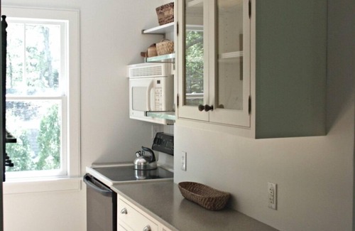 Our lovely, quiet home is on a wooded lane across from a small pond (you can hear the frogs at night!). Private apartment entrance and stairway up to light-filled rooms on second floor. Laundry room, tons of closet space, oak floors throughout, central AC. Perfect for a couple, 3 adults, or a small family; can sleep up to 4 with queen bedroom and full-size sofabed in living room. Kitchen has custom cabinets, Corian counters, D/W, glass-top electric range/microwave. Tiled bath has oversize jetted tub and rain shower.
