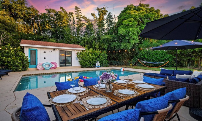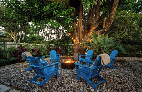 Welcome to your modern beach house retreat in West Palm Beach! This beautifully updated home offers a sparkling pool, outdoor games, and ample lounging areas in the spacious yard. Perfect for families, friends, or remote work, it features 4 stylish bedrooms, a tropical living area with a 75-inch smart TV, and a cozy fire pit for relaxing evenings.