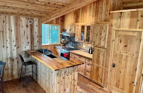 Gorgeous red cedar lines the walls and vaulted ceilings of the "Treehouse," a newly-built 2-bedroom apartment that sits above our garage. Enjoy your morning coffee on the large wooden balcony with beautiful lake views peaking through the surrounding pine trees. Large windows and an open floor plan create a light spacious area to relax and make yourself at home. This unit is just steps away from gorgeous Priest Lake, including a spacious shared 69-feet of sandy beach with a dock and fire pit.