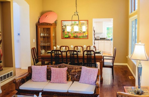 This house boasts two spacious living rooms, the formal living room has teak furniture from Thailand and a piano. See if your children can count how many elephants are carved into the furniture. In the other living room, you will find a gigantic 75” TV and stereo, two large sofas, a comfortable reclining chair, and a workspace with monitor.