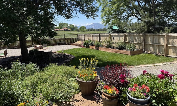 Wake up to stunning mountain views from your gigantic master bedroom windows, surrounded by farmland. Enjoy four workspaces, four bedrooms, 3 full bathrooms, comfy beds, beautiful decor, and loads of amenities. Easy access to downtown Boulder, bike trails, and mountains. Located at the end of a quiet cul de sac and backing up to open space with a stunning mountain view. High ceilings and windows that fill the home with sunlight. Relax with the whole family at this peaceful place to stay. Except the basement, guests have access to the entire home, 2-car garage and back yard, no spaces are shared with anyone.