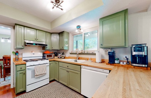 Inside, you'll quickly feel at home amidst the naturally lit interior, which displays the perfect mix of modern convenience and rustic comfort. When you find yourself dining at home, the well-equipped kitchen boasts all of the necessities: a full-sized fridge, oven, dishwasher, microwave, and coffee makers. Smart TVs are available for movie nights in the living room, family room, and primary bedroom. Central air-conditioning and a private washer/dryer round out the interior perks.