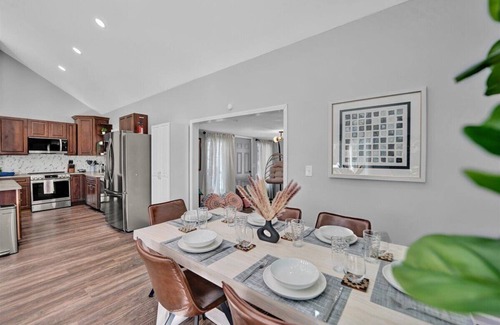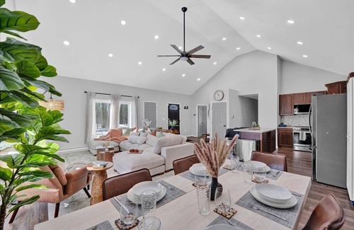 Stay where guests rave about the private hot tub, luxe king beds, family game room, and peaceful backyard with fire pit. Enjoy a fully stocked kitchen, sun-filled living spaces, fast Wi-Fi, and dog-friendly touches — all just minutes from skiing, waterparks, and hiking.