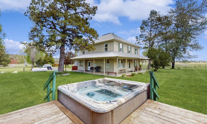 Experience authentic ranch living in our 130-year-old, featuring 5 bedrooms and 5.5 baths. Enjoy meals on the front porch with views of grazing cattle or fish in one of our stocked ponds. Visit the friendly goats, book a trail ride, or explore our 438-acre property. Relax in the hot tub or join us to feed the horses. Need more space? Ask about booking our additional houses on-site. Perfect for family retreats on a working cattle ranch.
