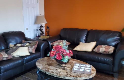This beautiful split level home in a suburban neighborhood of Jonesboro Ga. boasts 3 beautifully decorated bedrooms, 2 full baths, game/office room, large eat in kitchen, family room with large screen T.V. This home sleeps 7 comfortably large enough for 10. 20 minutes from Hartsfield Airport, 7.4 miles from major HWY, 7 miles from Atlanta Motor Speedway, 3.9 miles from Clayton International water Park. Perfect for staycation. Local shopping, open air malls, and local eaterys.