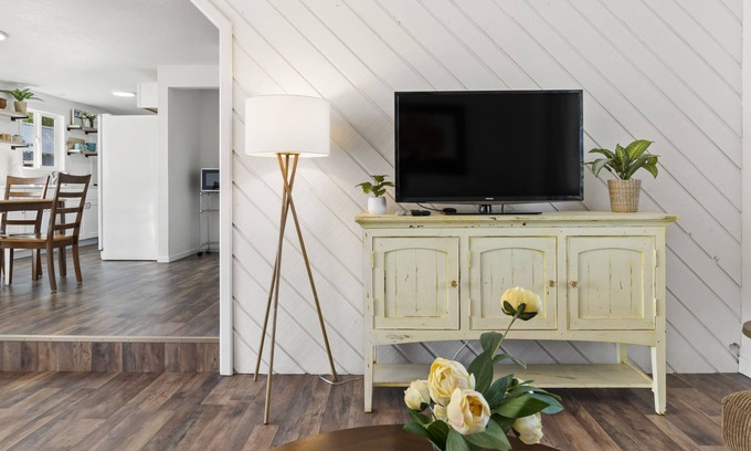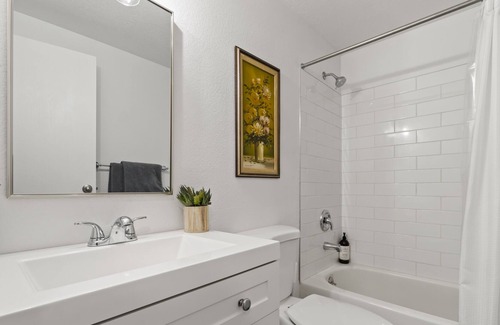 Located next to the bedrooms, includes a new vanity, mirror, toilet and new white subway tile shower. Also included are fresh towels, hand soap, shampoo and conditioner.
