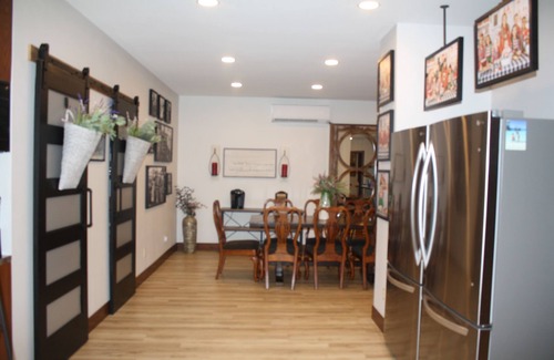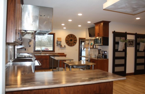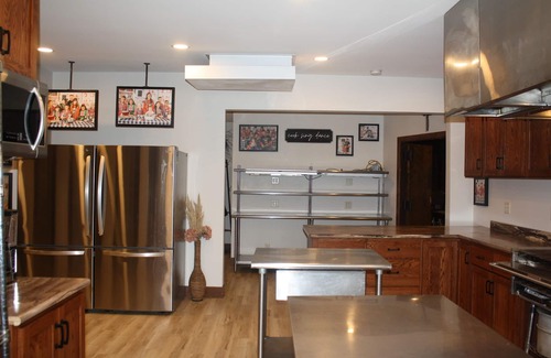 The whole group will be comfortable in this spacious and unique space. This newly renovated home once was a restaurant and 3 apartments. Now, the combined 6000 sq. ft. home offers 3 kitchens, 4 living areas, bar seats 32, 4 washers/dryers, 6 bedrooms, and 6 bathrooms. It can occupy up to 30 guests with numerous indoor and outdoor activities- 3 pickleball courts, a volleyball court, and basketball. 5 miles from the Field of Dreams Movie Site. Across the street is Rolling Knolls Golf Course.