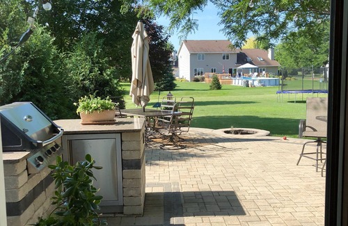 A clean, smoke-free home located in a quiet neighborhood 3 miles from the EAA grounds. This 4 bedroom home comfortably sleeps 7-8 people with 1 king, 2 queens and a full size bed. The home has 2 full bathrooms upstairs and a 1/2 bath on the first floor. Amenities include: large shaded patio, lighted sport court, open concept kitchen and family room, lower level rec room and first floor laundry. Central air, wifi/cable, gas grill, laundry, outdoor sports, fire pit and parking for 3-5 vehicles in the driveway are all included with this rental. Large, open backyard in flight path is great for catching views of airplanes. Home is conveniently located off 41, near shopping and many restaurants.