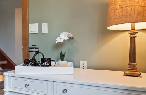 Welcome to Sisters Retreat, a beautifully designed two-story retreat offering 1,300 sq. ft. of stylish comfort. This centrally located space is the middle unit of a three-unit property, providing a private apartment-like setting with shared walls when rented individually. Please note that the doors remain locked by management to the Pine Street Loft and Jefferson Hideaway unless booked together. Step into a full chef’s kitchen, thoughtfully stocked with barware, spices, and essential kitchenware, perfect for preparing delicious meals during your stay. While laundry is not available on-site, a highly-rated laundromat with new oversized machines is conveniently located in town for your needs.