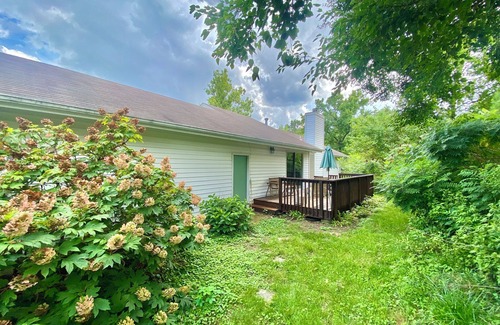 Relax at this peaceful 5-bedroom, 3-bathroom house at the end of a safe residential street. Quiet, clean, comfortable, and convenient. This delightful property offers 1 king bed, 3 queen beds, and 3 twin beds, perfect for a group getaway. With excellent WiFi, AC, a deck, and other amenities, you will feel right at home. Surrounded by a large native plant garden with a trampoline. One minute away from Highway 170, a short drive to all St. Louis attractions. We're happy to help with any questions.